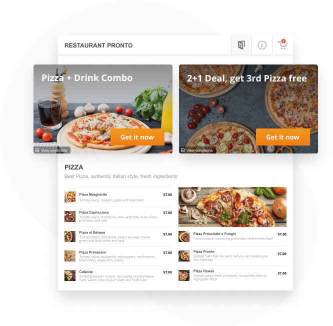 Choose from the extensive list we provide, customize it with your own image, text, and parameters, and publish it in your online menu. It will be displayed at the top, so customers can’t miss it.