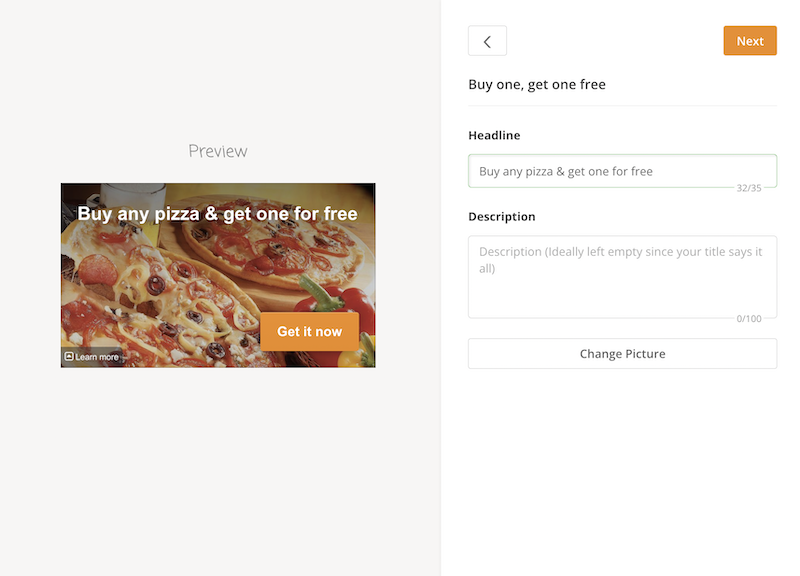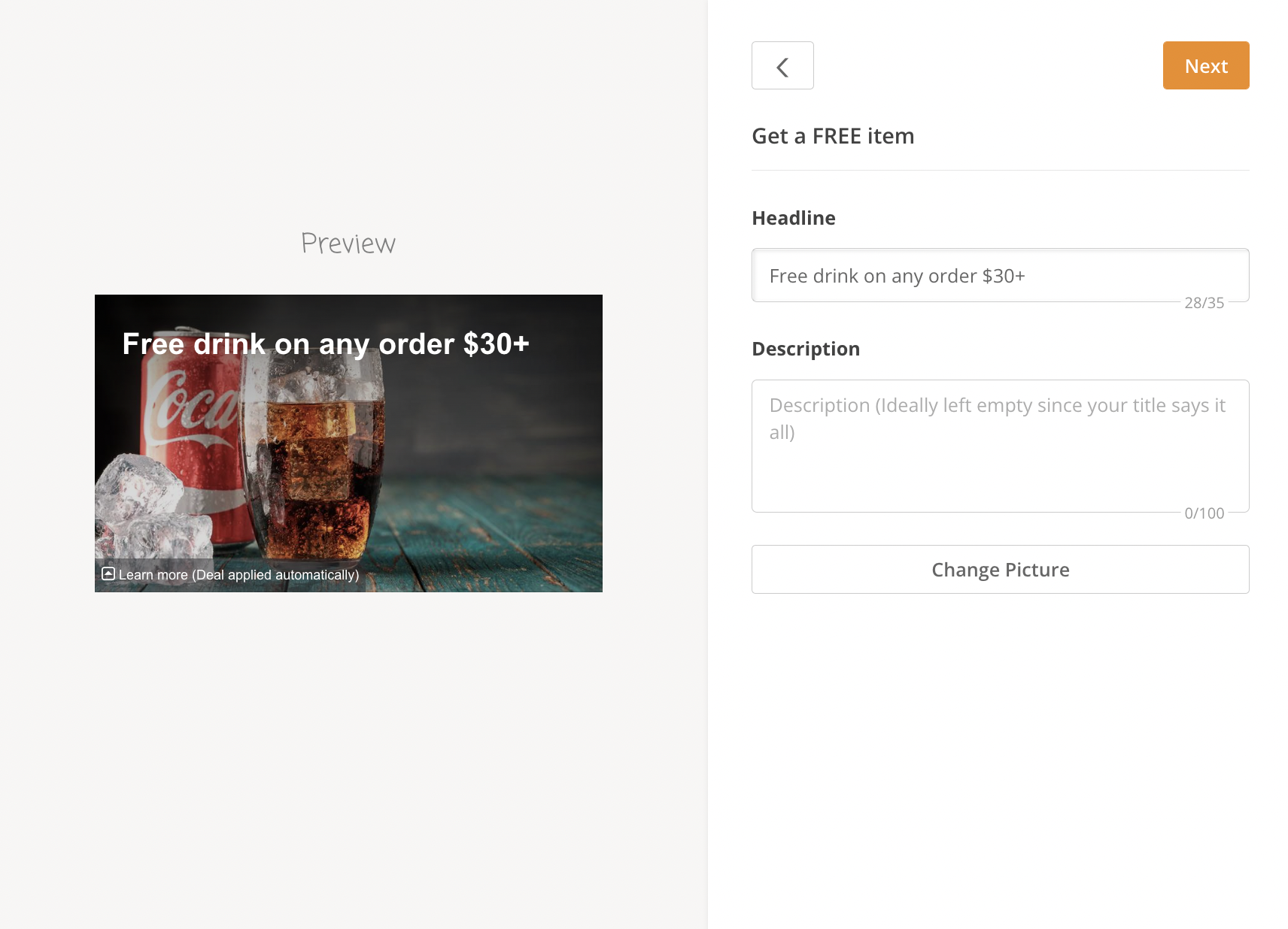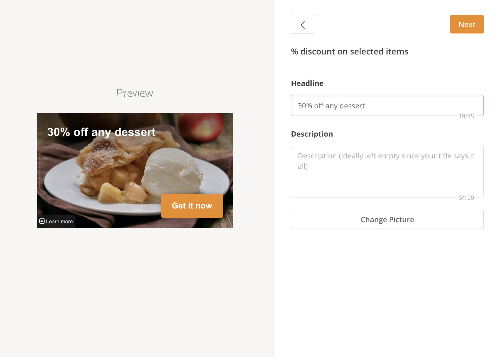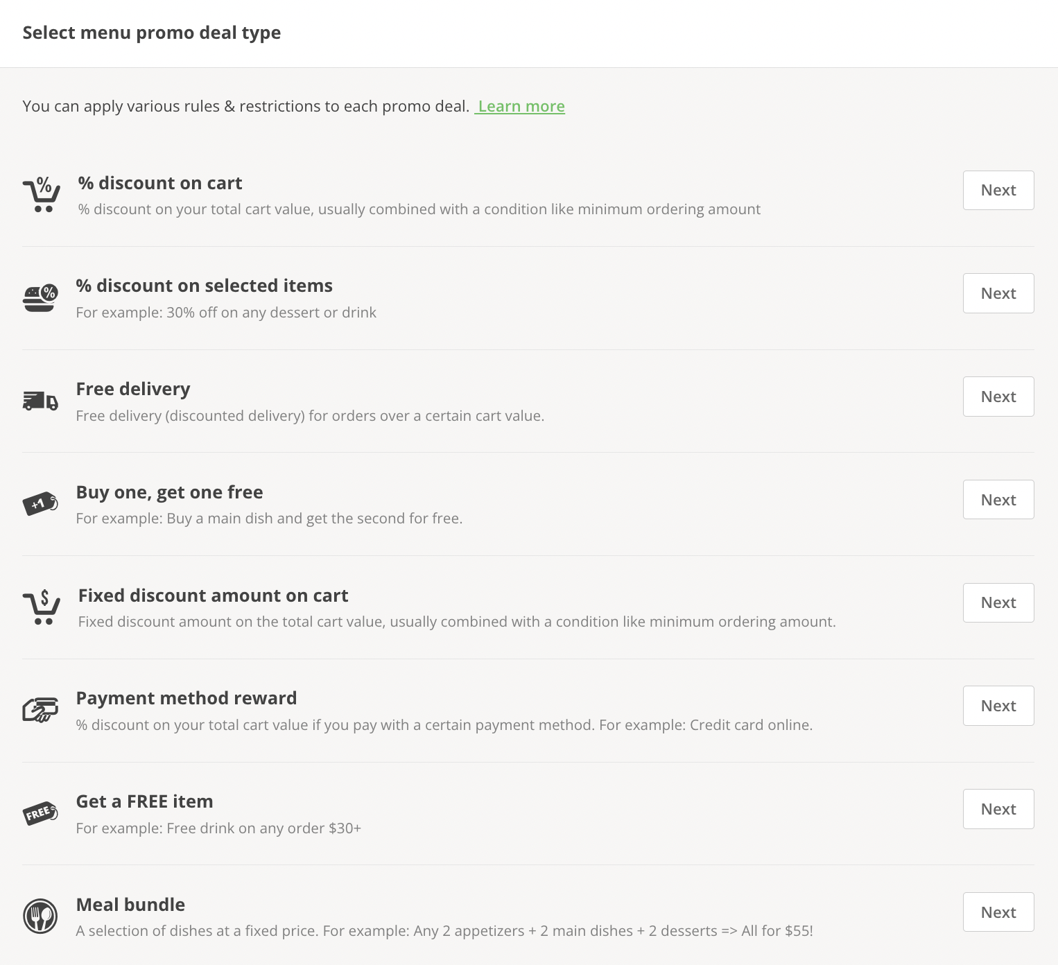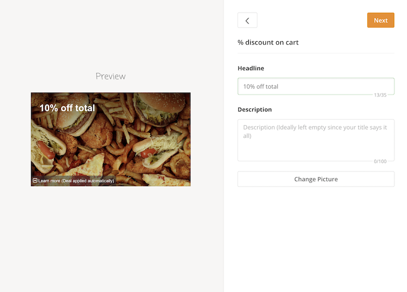 - Select the type of discount or promo you want from the list to start customizing it to your liking