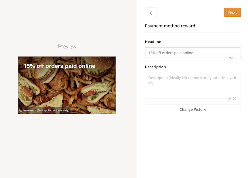 Another way to reward customers and encourage them to pay for their food online is to offer a discount on all orders paid online. This is particularly useful if you want to minimize the amount of cash you exchange with your customers.