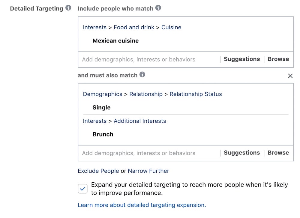 For example, let’s say you’re the owner of a Mexican restaurant and you want to create an ad that promotes your upcoming Valentine’s Day promotion. You can target people who like Mexican cuisine, spicy food, and dishes like taco, burrito, enchilada, etc. You will find all these options in Facebook’s detailed targeting section. But what if Facebook tells you the audience is still too broad?