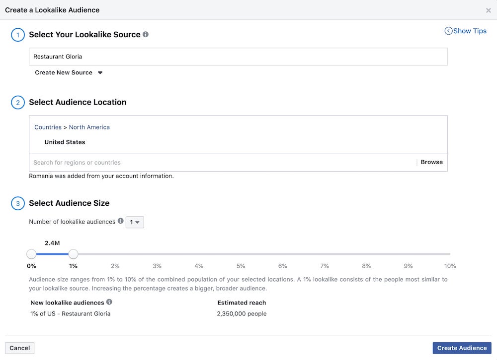 After targeting people who already interacted with you or your page, it’s time to also look at people similar to them. Facebook lets you do that in Lookalike Audiences. These people share characteristics like age, location, gender, occupation, and so on with the people who already interacted with you. This is how to find potential customers on Facebook that would be more inclined to dine with you than others.