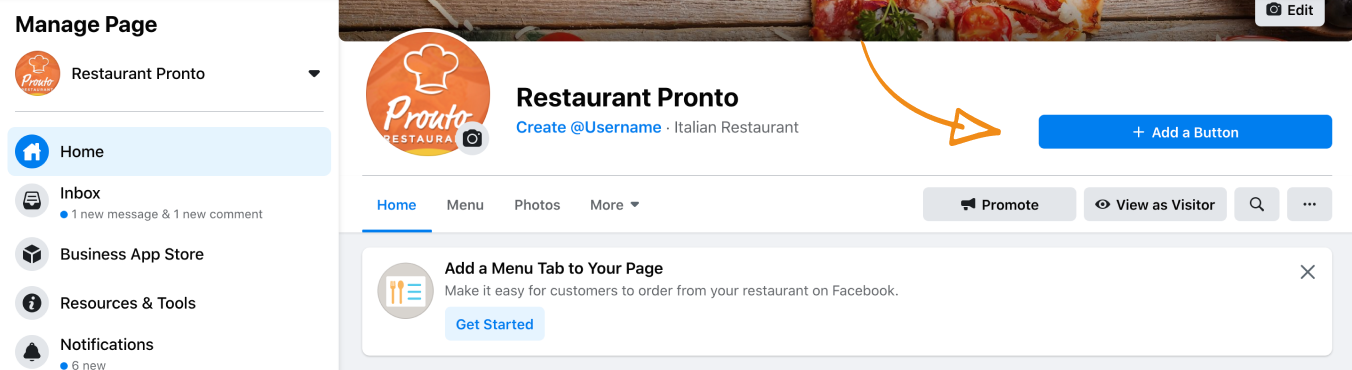 Go to your restaurant’s Facebook page and click on the “Add a Button” button.