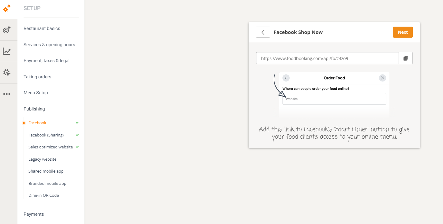 First things first: go to Get Access Now button, in the top right corner of this page and set up your restaurant profile. Then move onto the “Publishing” section -> “Facebook.”