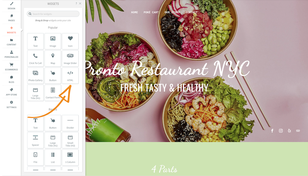 - Drag an HTML widget over the page and drop it in the space where you want the button to appear.
