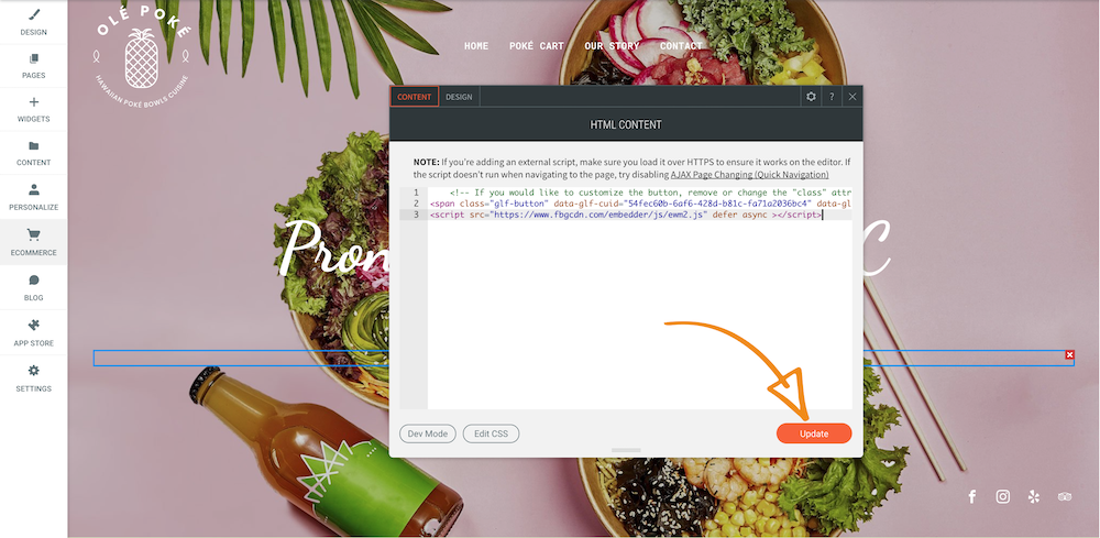 - In the HTML Content popup, paste the code for the ordering button from your restaurant’s admin page.