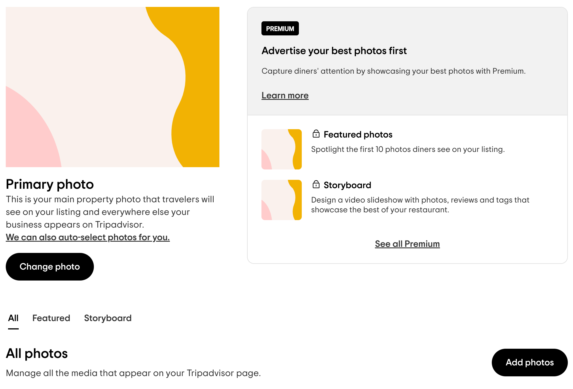 To do that, sign in to your TripAdvisor business page, then go to Manage Listing and choose Photos. Choose your primary photo and click the “Add photos” button to enrich your profile with more images.