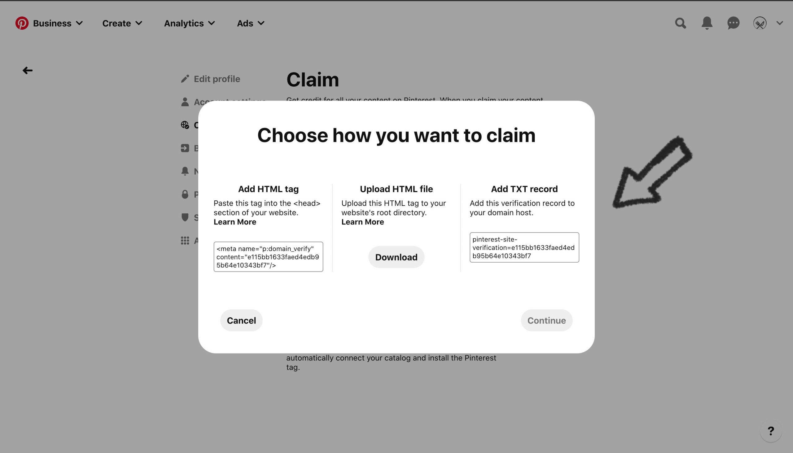 To claim it, go to your Pinterest business menu and click on “Claim,” then select “Websites.”
