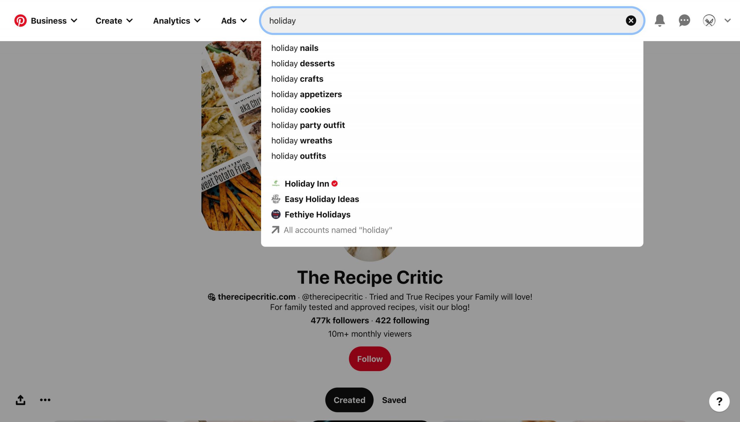 Remember to use relevant keywords when naming your holiday boards. A simple search in Pinterest’s search bar starting with the word “holiday” will suggest terms like “holiday desserts,” “holiday appetizers,” “holiday baking,” “holiday decor,” or “holiday cookies.” These are popular terms that people regularly search for, so you should target them in your board and pin names.
