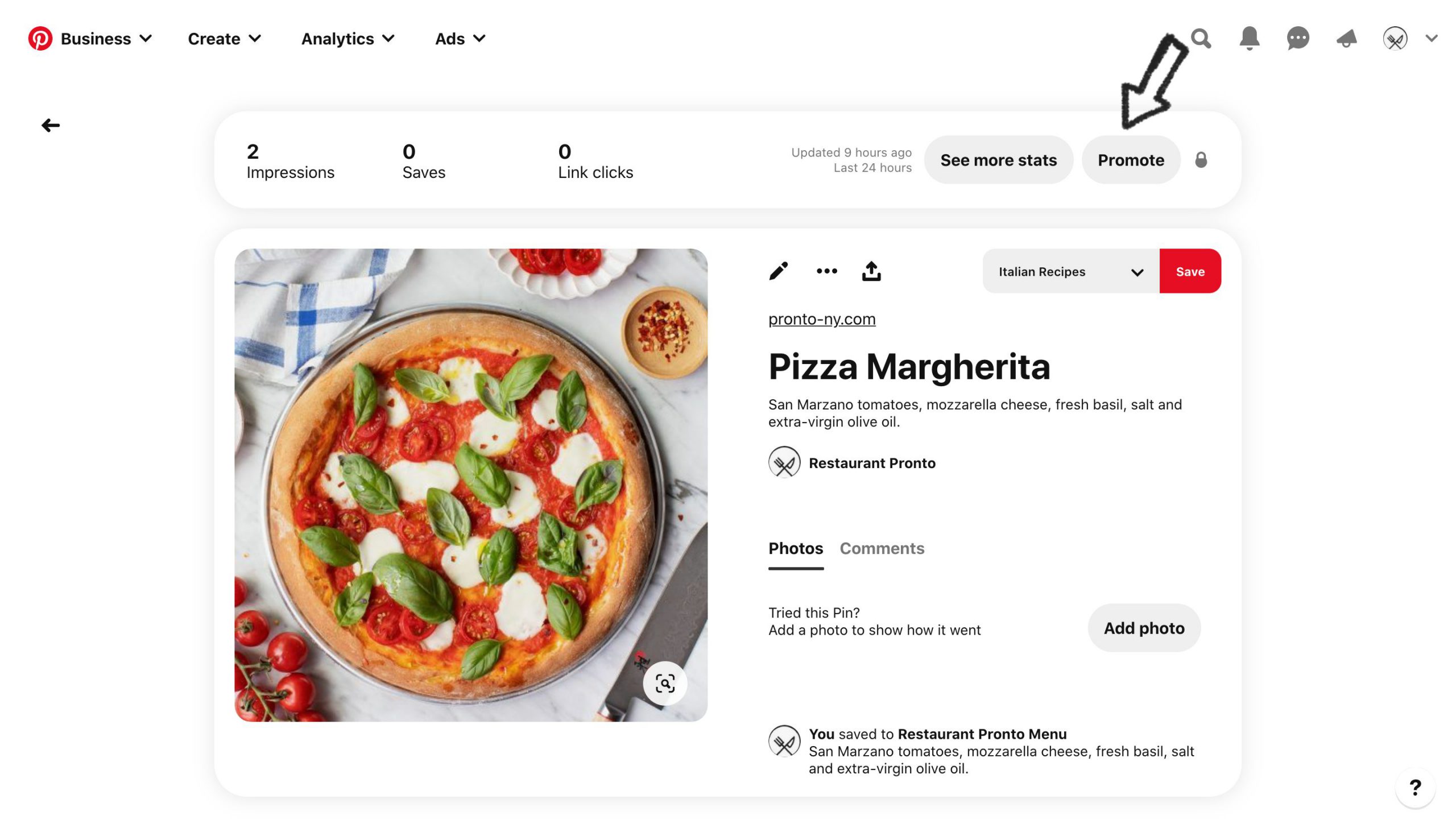 If you want some extra oomph on a pin, especially pins that redirect to your website, like your Pinterest restaurant menu pins, you can try to promote them. According to the platform, you will get a $4.30 gross return for every dollar you spend on advertising. With a return on investment such as this one, it couldn’t hurt to promote some pins.