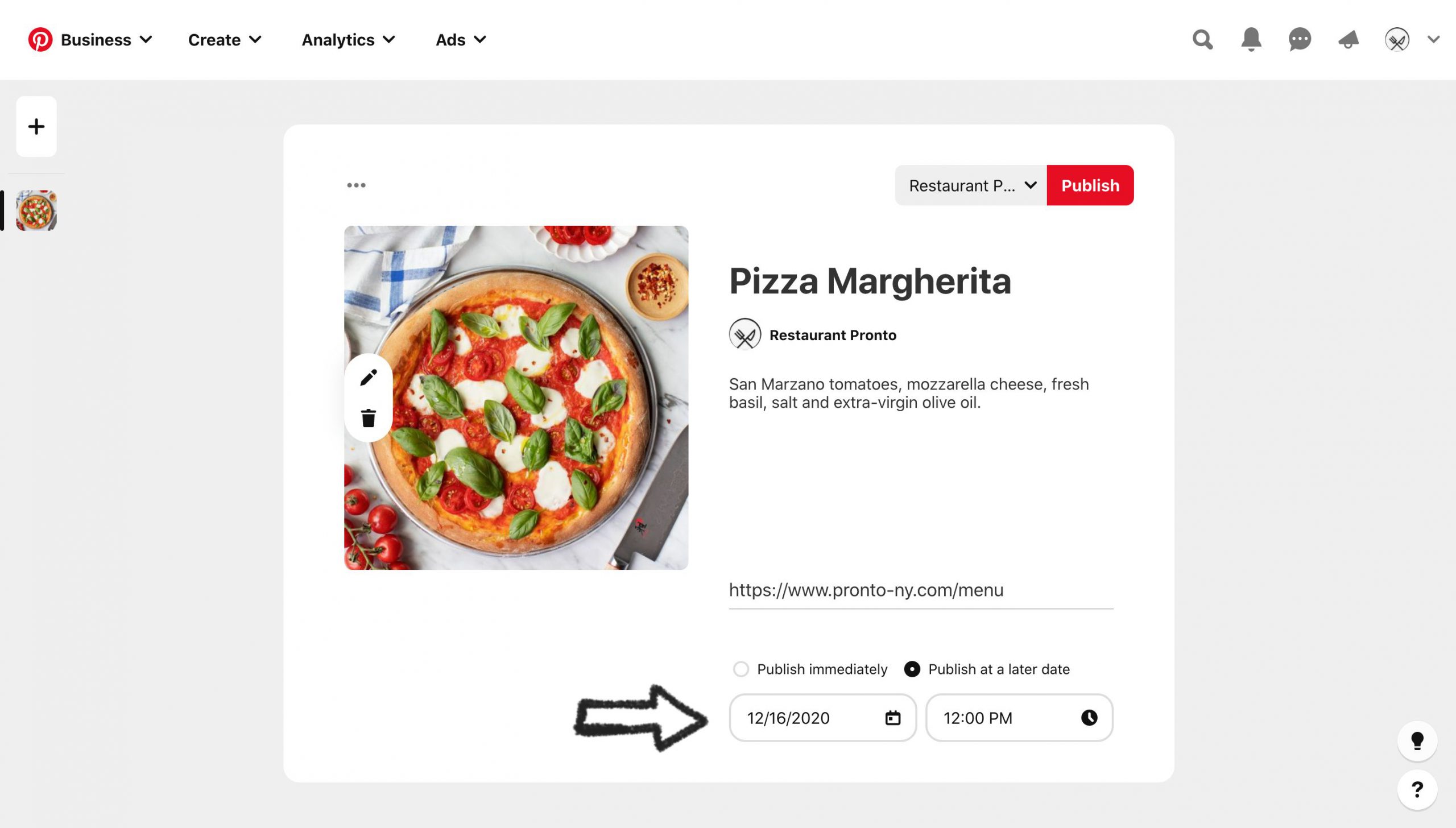 Each pin should contain a title, a description, and a destination link. So, let’s say you want to add “Pizza Margherita” to your menu: