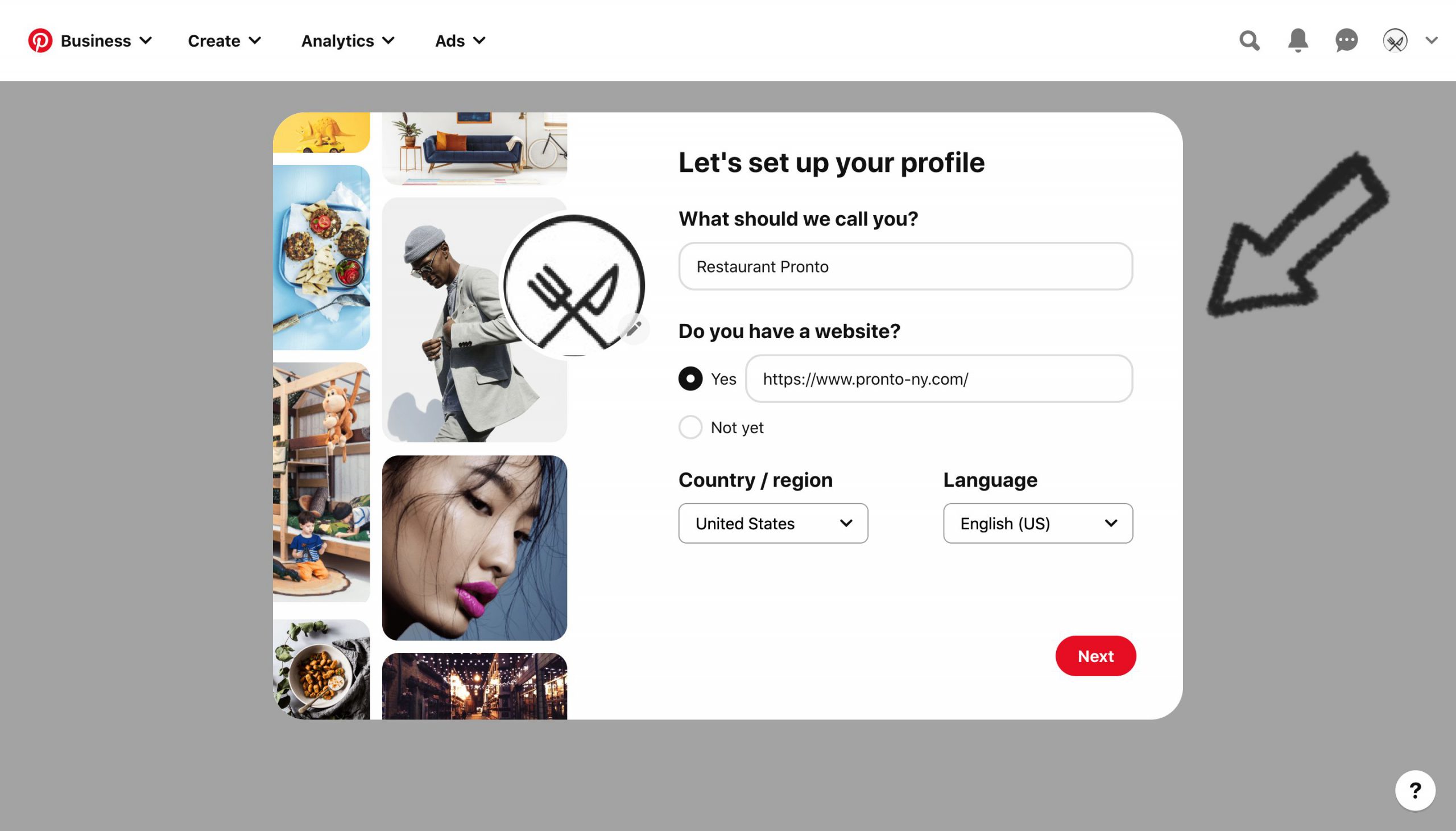 Now that your profile is up and running, Pinterest will suggest some actions you can take next. For now, your main priority should be to add more information about your brand, such as your restaurant location.