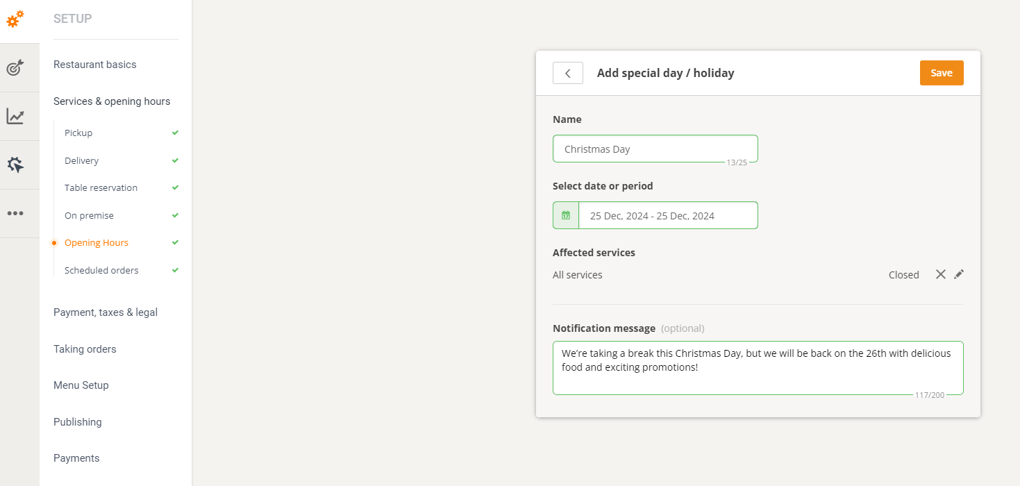 You can also use the “Add special day/holiday” option to update your opening hours or set your restaurant as closed for Christmas, New Year’s, or any other holiday.