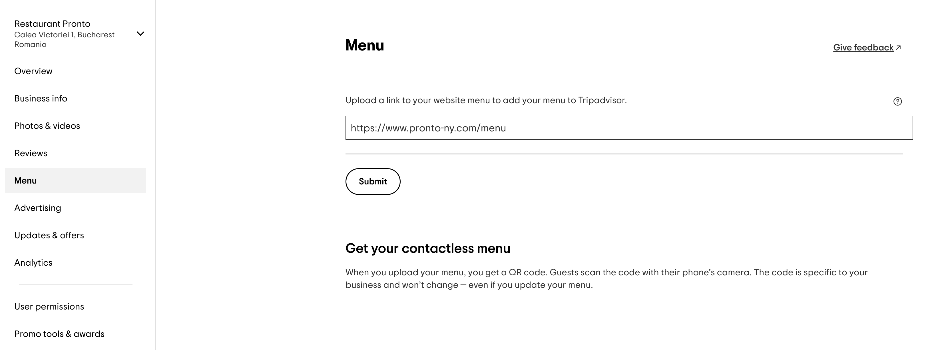 Adding your menu on TripAdvisor is very easy if you have a menu already displayed on your website. All you have to do is go under the Manage Listing tab and choose Menu. In the designated box, insert the menu URL from your website and click the “Submit” button.