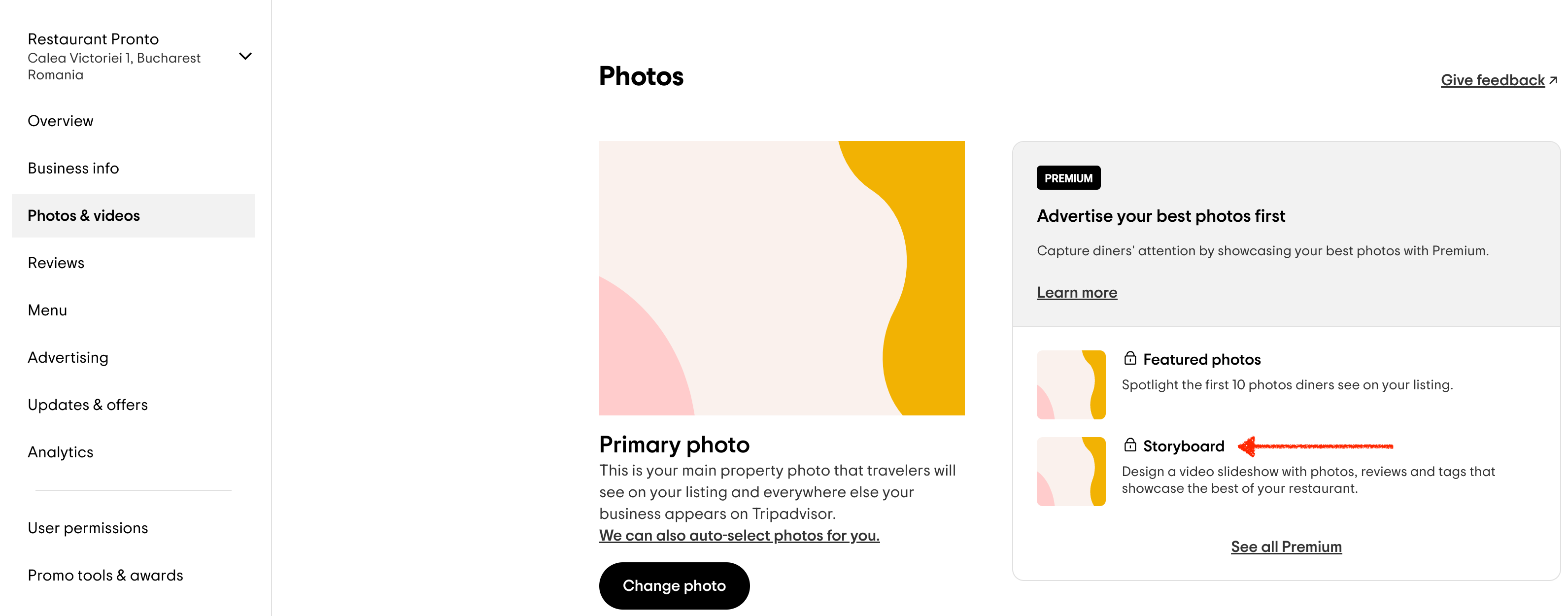 Did someone say restaurant slideshow? Go to Manage Listing, Photos & videos, and select “Storyboard” to see some magic come to life.