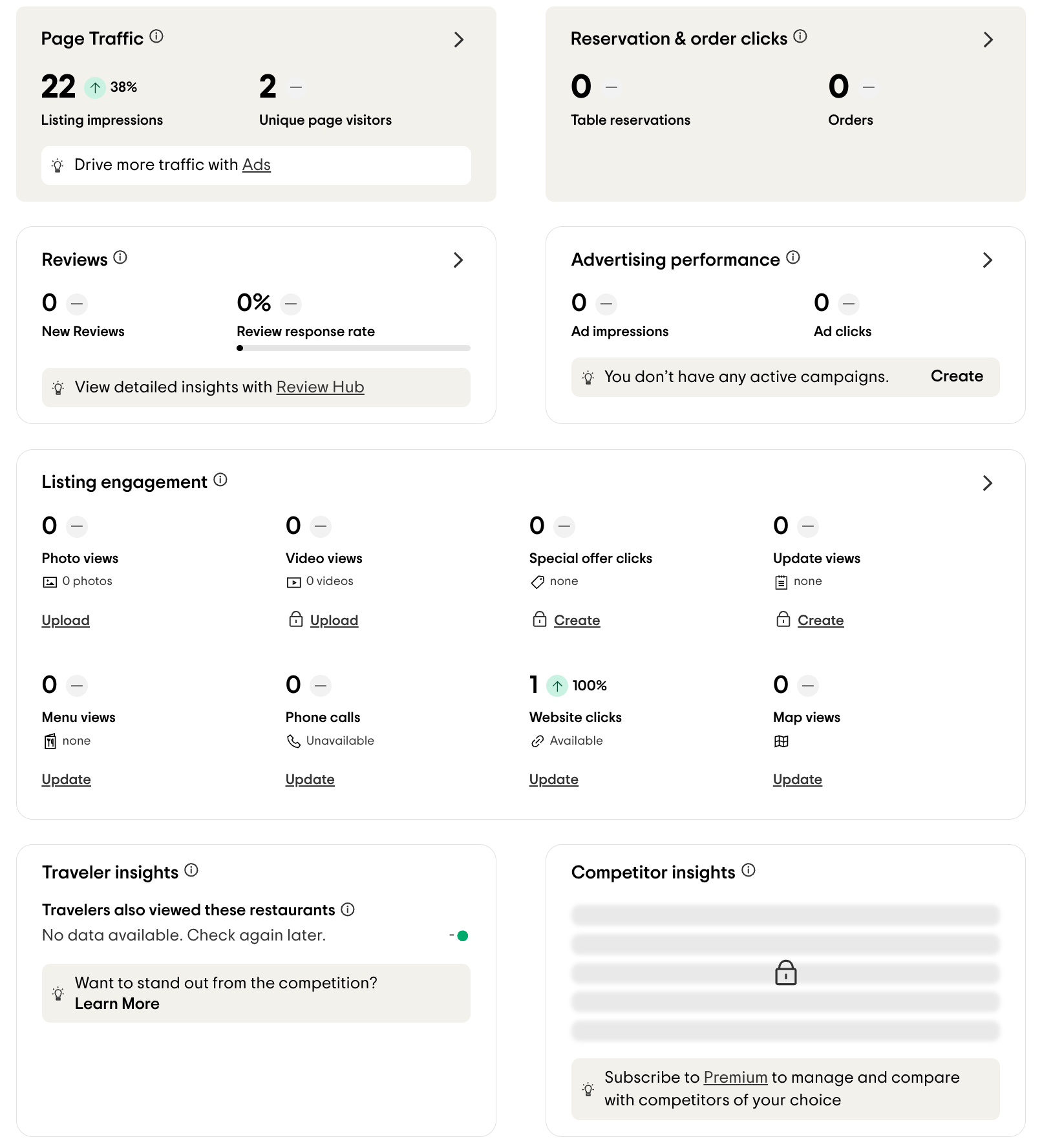 - Engagement with your listing (photo views, special offer clicks, menu views, phone calls, etc.)