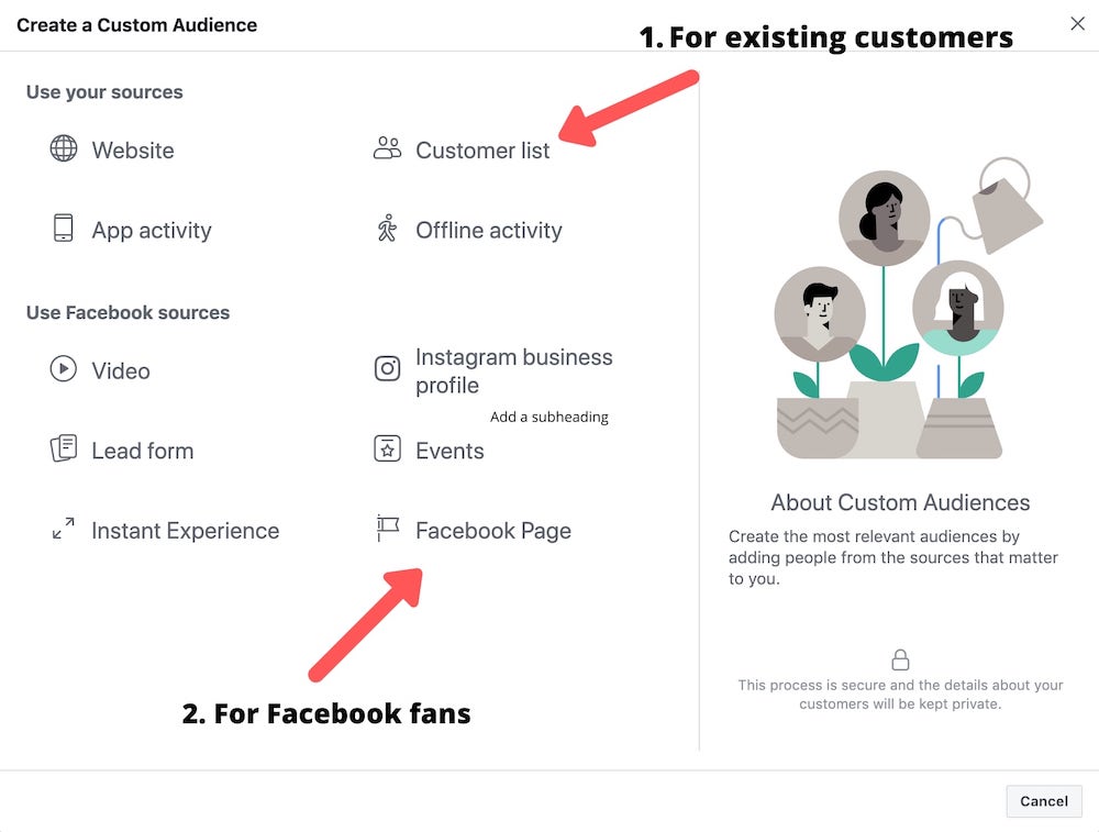 You can target the first segment (existing customers) by creating a Custom Audience. Choose “customer list” to input a list of email addresses of your former customers so that Facebook can show them your ad.