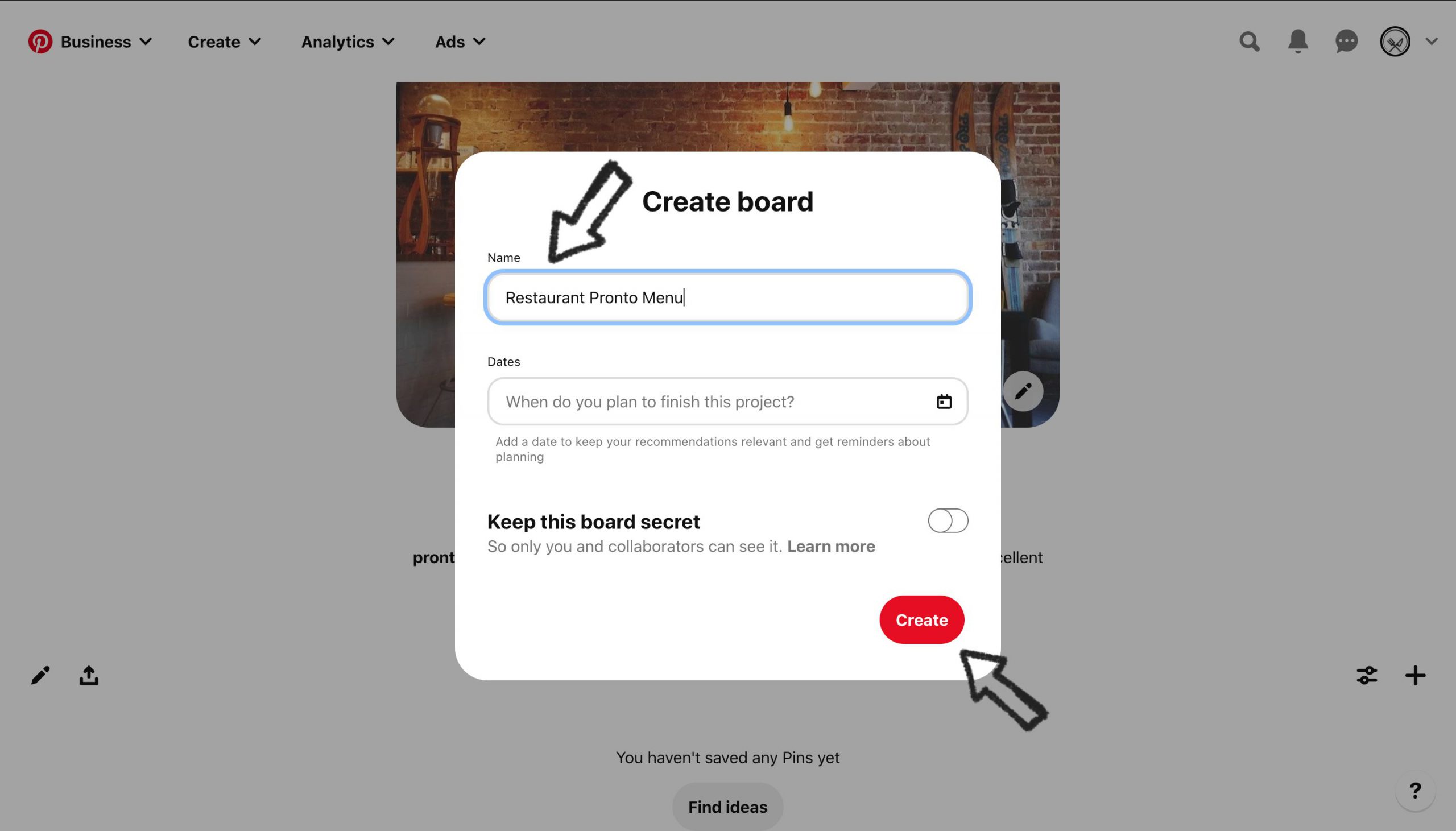 Make sure the pin is in the right board, then save it. Do the same for the rest of the items on your menu to display your entire restaurant menu on Pinterest and give people a link they can click on to order food.