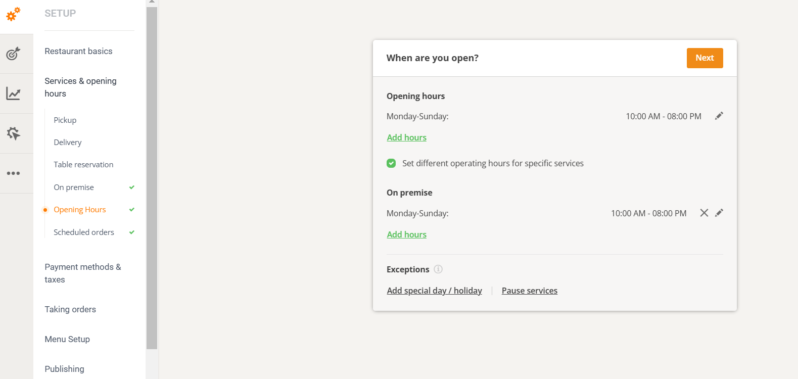 Once you sign up and enter your basic information, you can go to Setup -> Services & opening hours -> Opening Hours and set separate opening hours for dine-in, pickup, delivery, and even table reservations.