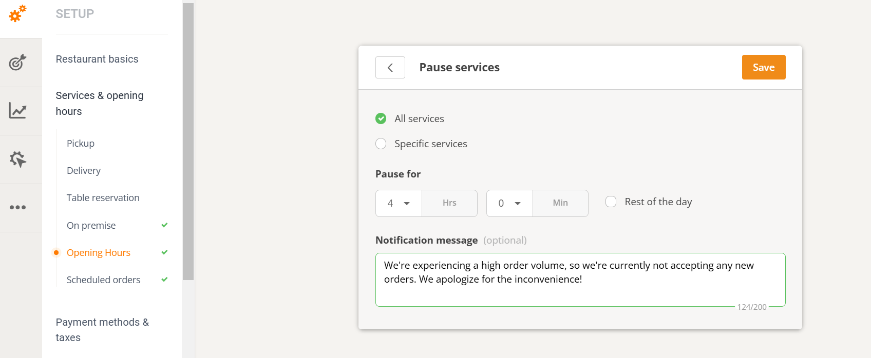 This way, when you do open, you can see the new orders and better organize your day. Enable this useful feature by going to Setup -> Services & Opening hours -> Scheduled hours and click on Yes.