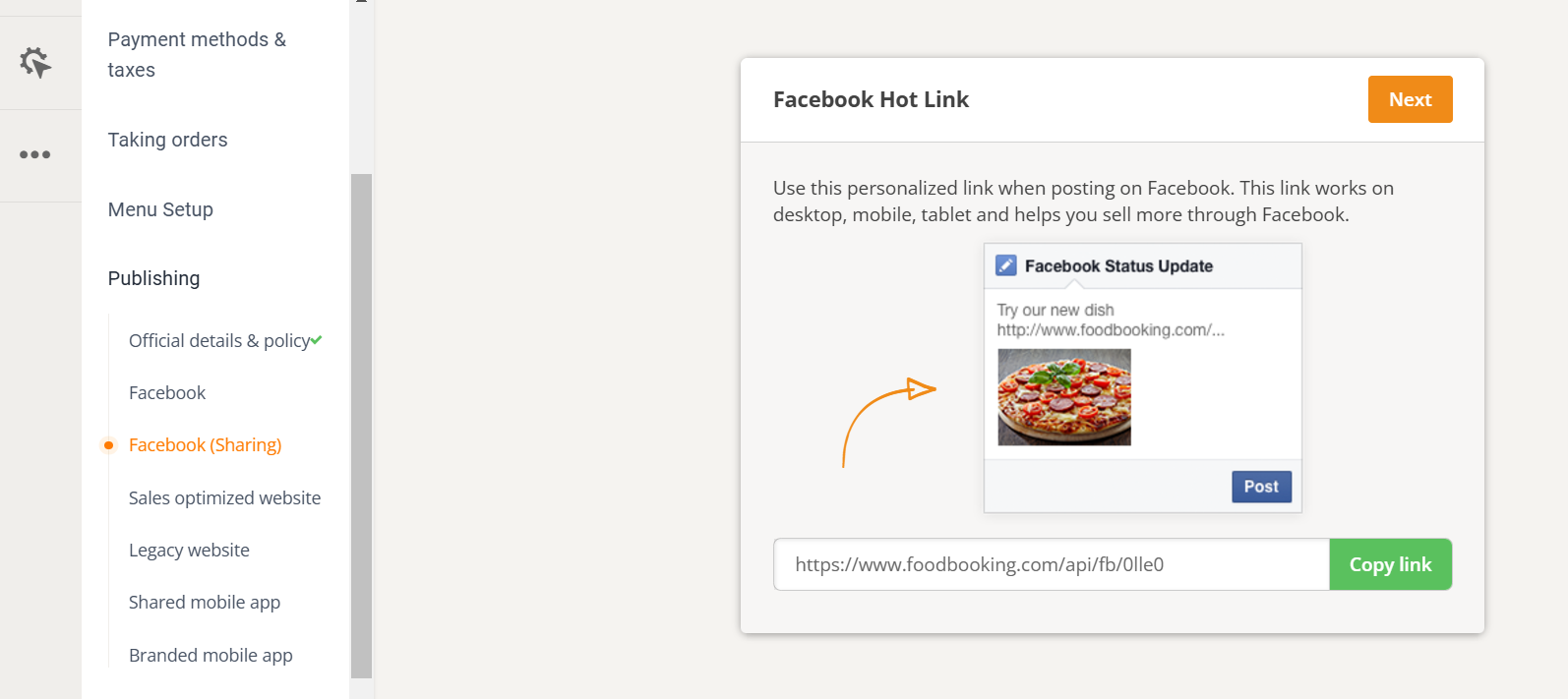 You can take a screenshot of the offer and post it on social media, too, with a link that people can click to access your menu. For Facebook, you can use our special sharing hotlink by going to admin -> Setup -> Publishing -> Facebook (Sharing).