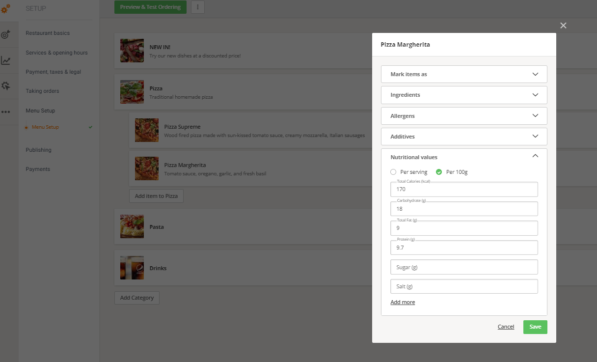 Once you’ve saved the changes, here’s how your customers will see the nutritional information displayed on your menu: