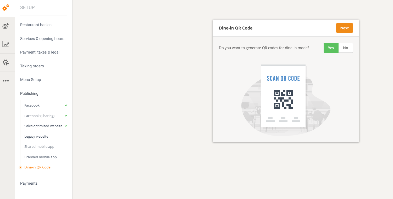 Now it’s time to generate your tableside ordering QR code. Go to Setup -> Publishing -> Dine-in QR Code, click ‘Yes,’ and ‘Next.’