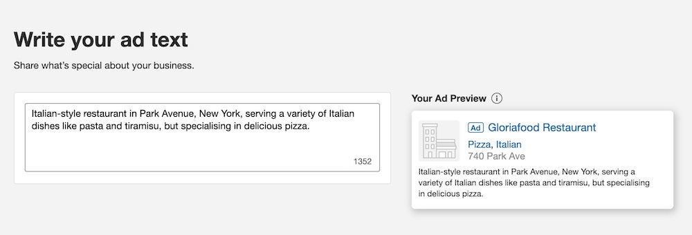 To get started with advertising on Yelp, go to Yelp Ads in your Biz menu. The first thing you’ll be directed to do is to write the ad text, then click “Next” and choose your ad budget. Here is an example of an ad you could run for an Italian restaurant.